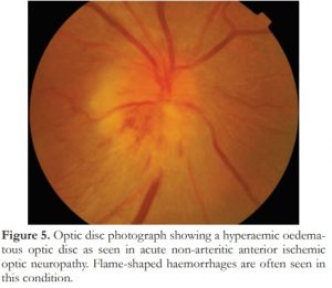 Figure 5. Optic disc photograph showing a hyperaemic oedematous optic disc as seen in acute non-arteritic anterior ischemic optic neuropathy. Flame-shaped haemorrhages are often seen in this condition.