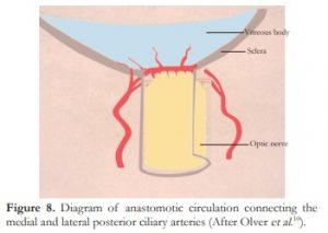 The microcirculation in the optic nerve head has been further evaluated by Olver et al. who demonstrated superior and inferior anastomotic channels connecting the medial and lateral posterior ciliary arteries (Figure 8).10 The superior anastomosis, presumably the less efficient one, is thus the watershed area in the event of perfusion failure. Its involvement explains the common inferior visual field defect encountered in acute NA-AION. These tiny vessels are gradually occluded by inflammation and the acute visual loss may be precipitated by a fall in perfusion or hydrostatic pressure as occurs on awakening or arising in the morning.