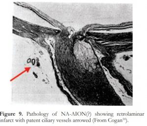 There is no convincing pathological report in respect of NA-AION unlike that for the arteritic variety as shown earlier. An illustration in Cogan’s book (Figure 9) depicting a retrolaminar infarct in the optic nerve could be an instance of NA-AION but there is no clinical report in the text to support this possibility.