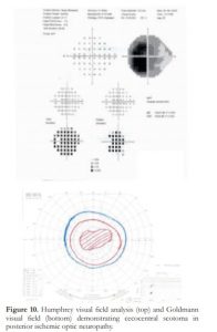 Figure 10. Humphrey visual field analysis (top) and Goldmann visual field (bottom) demonstrating cecocentral scotoma in posterior ischemic optic neuropathy.