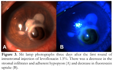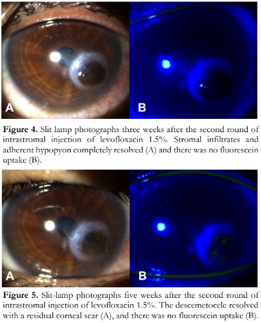 In both cases, we did not observe any adverse events. Corneal scarring is common following an infection as a part of corneal healing. We also did not observe any crystalline deposits which has been reported following treatment with gatifloxacin and ciprofloxacin.17 This could be due to the less acidic pH of levofloxacin 1.5% at 6.5.18 Other possible adverse effects of intrastromal injection include Descemet membrane detachment, corneal perforation, endothelial decompensation, intrastromal bleeding, hyphema, and endophthalmitis.4,10 Patients must always be informed of the risks and the procedure must be performed with caution.