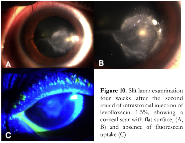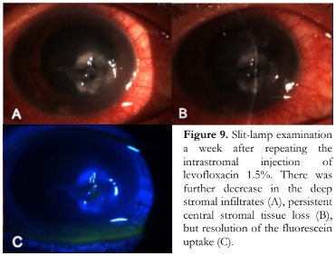 A repeat intrastromal injection of levofloxacin 1.5% was done on the same sites and the other medications were continued. One week later, vision improved to counting fingers at 3 feet. There was further decrease in the stromal infiltrates and resolution of the fluorescein uptake (Figure 9).