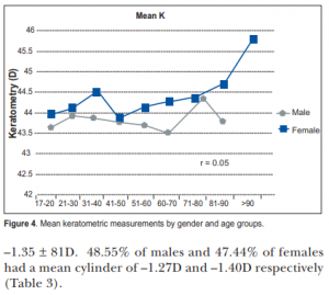 The mean steepest K was 44.6D for the entire population; 44.35D for males and 44.8D for females. Females had higher corneal curvature radii than the males (p = 0.001) (Table 2).