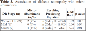 Patients with no diabetic retinopathy have lesser probability of having microalbuminuria (p = 0.001). The odds ratio of 0.09 meant that patients diagnosed with diabetic retinopathy were (inverted odds) 10.99 times more likely to have microalbuminuria than those who have no diabetic retinopathy. Mild diabetic retinopathy was not significantly related to the presence of microalbuminuria (p = 0.99). The presence of severe diabetic retinopathy, however, was significantly associated with microalbuminuria (p = 0.01), where patients were 13.75 times more likely to have microalbuminuria than those who were diagnosed with milder stages of diabetic retinopathy (Table 3).
