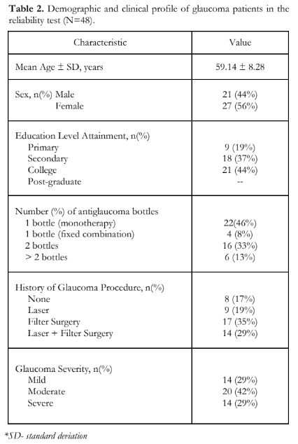 Filipino versions of the assessment tools using the guidelines proposed by Guillemin, such as the Glaucoma Quality of Life Questionnaire (GQL-15)8 and the Filipino Dry Eye Screening Questionnaire9 were tested and found valid. This current study aimed to translate the GMASQ and test the reliability of the Filipino-adapted GMASQ.
