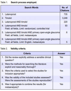 The reviewers in this study addressed a sensible clinical question: To compare the IOP lowering effects of latanoprost versus timolol in primary open-angle glaucoma. As previously mentioned, the method for literature search was explicit and thorough. However, there was no attempt to look for unpublished reports.