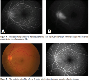 Toxoplasmic retinochoroiditis typically affects the posterior pole with either solitary or multiple lesions. Active lesions are gray to white foci of retinal necrosis with adjacent choroiditis, vasculitis, hemorrhage, and vitritis. Lesions close to or on the optic nerve can also lead to optic neuropathy. Other atypical presentations include punctate outer retinitis, neuroretinitis, pseudo-multiple retinochoroiditis, intraocular inflammation without retinochoroiditis, unilateral pigmentary retinopathy, Fuchs’-like anterior uveitis, scleritis, and multifocal or diffuse necrotizing retinitis. The initial decision on whether to treat a toxoplasmainduced retinal lesion would generally be made if it is within the temporal arcade, abutting the optic nerve or threatening a large retinal vessel, when the lesion has induced a large degree of hemorrhage, or if there is a substantial two-line drop from the visual acuity before the acute infection. The lesion in the case presented was located in the juxtapapillary area causing optic neuropathy as well as substantial vitritis; thus, the need for immediate treatment. Ocular toxoplasmosis has classically been treated with a combination of pyrimethamine, sulfadiazine, and prednisone; sometimes clindamycin is added (quadruple therapy). However, there have been very few randomized trials, and there is, in fact, no consensus regarding the best treatment regimen. Furthermore, concerns have been raised on the safety profile of the classic triple and quadruple therapy.