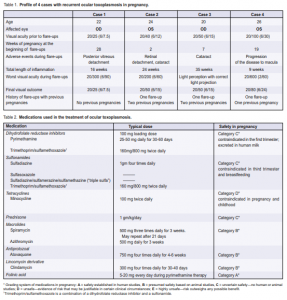 A 20 year-old Hispanic female from Brazil with a history of ocular toxoplasmosis diagnosed at 13 years of age was referred for treatment of decreased visual acuity of her right eye and pain of one-week duration. The patient was 8 weeks pregnant at the time of her initial evaluation at the Ocular Immunology and Uveitis Service. The patient did not have any significant medical history or allergies, and was not taking any systemic medications. She was using topical prednisolone acetate hourly and scopolamine twice daily in her right eye. Her visual acuity was 20/400 (3/60) in the right eye and 20/20 (6/6) in the left eye. Slit-lamp examination revealed keratic precipitates on the corneal endothelium, 3+ cells in the anterior chamber, and pigment deposits on the anterior capsule of the lens of the right eye. Dilated fundus examination showed an active toxoplasmic lesion adjacent to an old scar in the right eye, and 3+ vitreous cells. The left eye had an old chorioretinal scar, but there were no signs of active inflammation. The patient was begun on atovaquone 750 mg orally twice daily and clindamycin 300 mg orally four times daily. Her follow-up visit in 10 days revealed worsening visual acuity in the affected eye: light perception with correct light projection, 3+cells in anterior chamber and increased vitreous cells (4+). Systemic prednisone was added to the regimen at a dose of 60 mg orally daily. In spite of this therapy, inflammation persisted for the remaining 7 months of the patient’s pregnancy. On her follow-up visit 3 weeks post-delivery the patient’s visual acuity remained at 20/400 (3/60). There was active inflammation with 3+ cells in the anterior chamber and extensive posterior synechiae obstructing the view of the fundus, along with posterior subcapsular cataract. Atovaquone was substituted with pyrimethamine 25 mg orally twice daily, folinic acid 5 mg orally twice weekly and sulfadiazine 1000 mg four times daily. The patient was continued on clindamycin. Control of inflammation was achieved within five weeks after delivery, with resulting visual acuity of 20/80 (6/24) in the right eye.