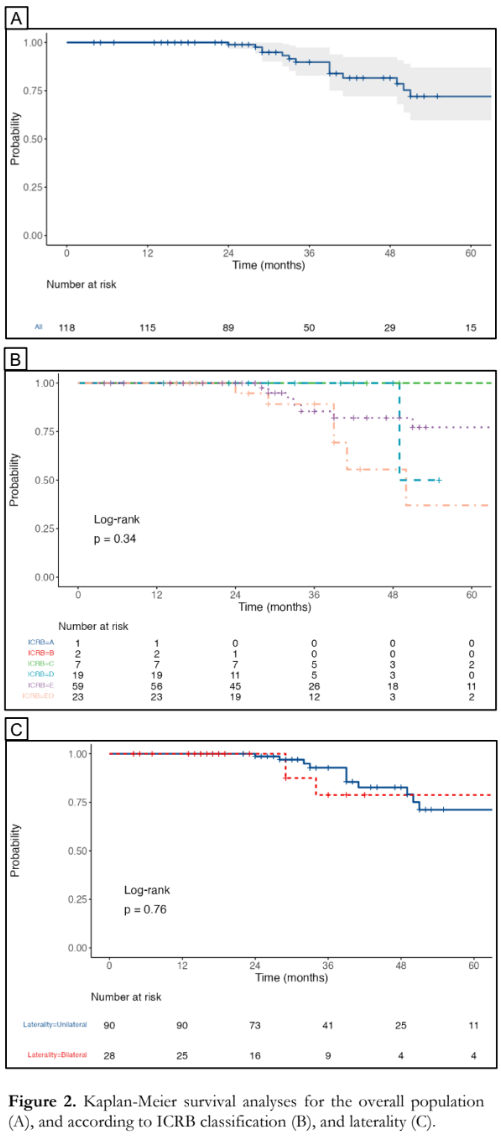 Median follow-up was 30.5 months (1st and 3rd interquartile range= 24, 48). Kaplan-Meier analysis for the overall population showed an overall survival of 100%, 89.8% (95% CI 82.8-97.4%) and 72% (95%CI 59.7-87%) at 2, 3 and 5 years, respectively [Figure 2A]. On log rank tests, there were no significant differences in survival among the different ICRB classifications (p=0.34) [Figure 2B] and between unilateral and bilateral disease (p=0.76) [Figure 2C].