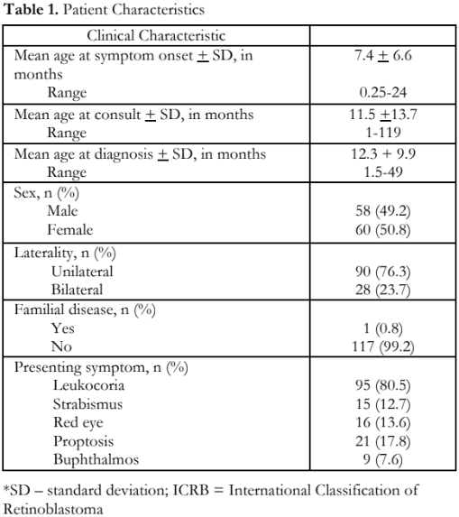 The following data from the medical charts were recorded: age, sex, laterality, age at symptom onset, age at initial consult, age at treatment initiation, initial presenting symptom, family history of retinoblastoma, International Classification of Retinoblastoma (ICRB) grade, treatment received, and the presence of high-risk features.