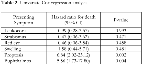 On univariate Cox regression analysis, patients who initially presented with proptosis and buphthalmos had significantly higher risk of death, with hazard ratios of 6.84 (95%CI 2.02-23.12, p=0.002) and 5.56 (95%CI 1.73-17.80, p=0.004), respectively (Table 2).