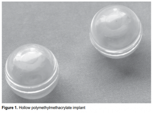 pressure patching, and repeat tarsorrhaphy. The implant did not extrude and no shortening of fornices was noted on last follow-up. Anterior granulomatous uveitis in the fellow eye of a patient in the hollow PMMA group occurred 8 weeks postoperatively and responded to topical steroids. Cases of mild ptosis were seen in each group and one case of superior sulcus defect in the solid acrylic group. These are commonly seen as late complications resulting from downward and anterior migration of the implant with deepening of the superior sulcus.15 The patients in both groups were satisfied with their prosthesis fit and no further surgical intervention was done. This study is limited by its small sample size and the short follow-up period, which could not establish the longterm stability of the hollow implant. Nevertheless, the study showed that hollow polymethylmethacrylate implants are comparable substitutes for solid acrylic implants with similar rates of complication. A larger sample size with longer follow-up period is needed to establish the long-term stability of the implant.