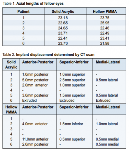 Axial length measurements and weight of implants The mean axial length of the fellow eyes was 23.38mm ±0.817 in the solid acrylic group and 23.34mm ±1.424 in the hollow PMMA group (Table 1). The hollow PMMA implant weighed 2.5g, half the weight of the solid acrylic implant.
